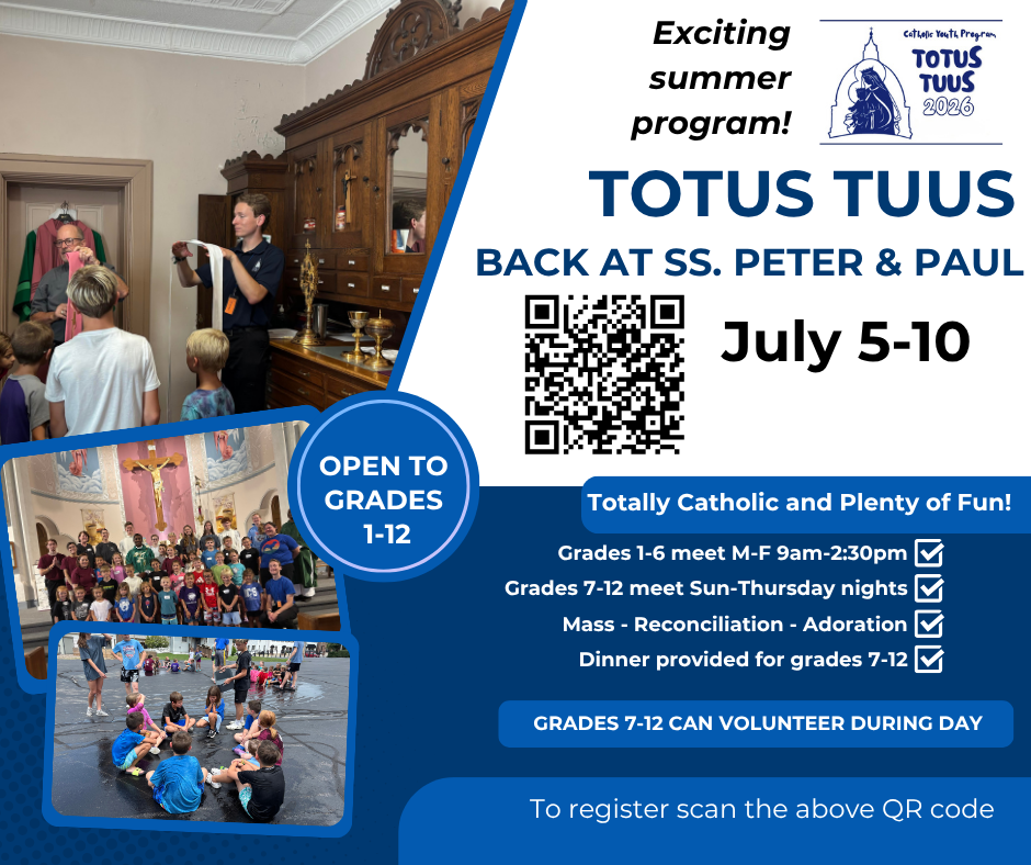 Totus Tuus is a week-long parish program designed to help students entering grades 1–12 deepen their faith and grow in their relationship with Christ through the Sacraments, prayer, and engaging activities.