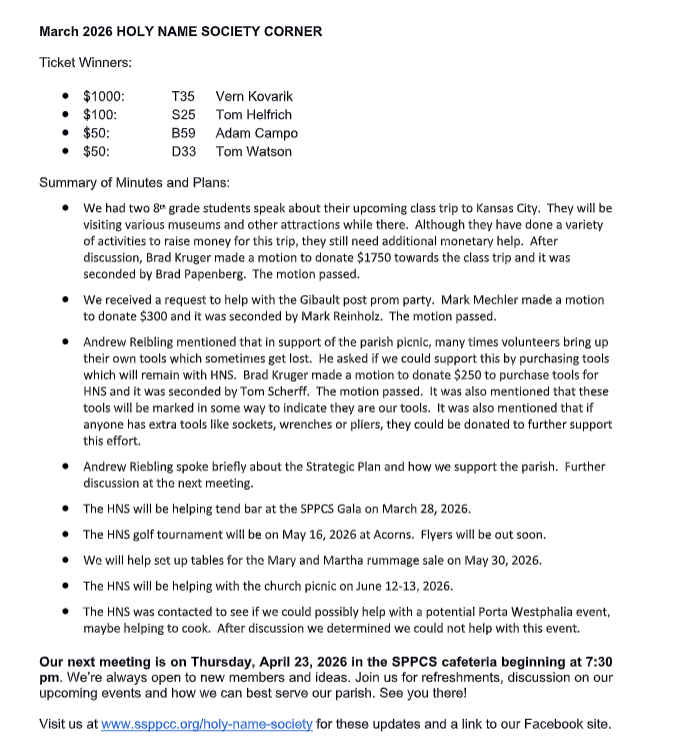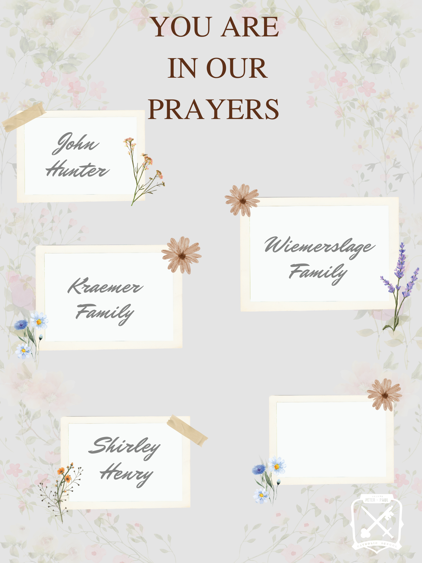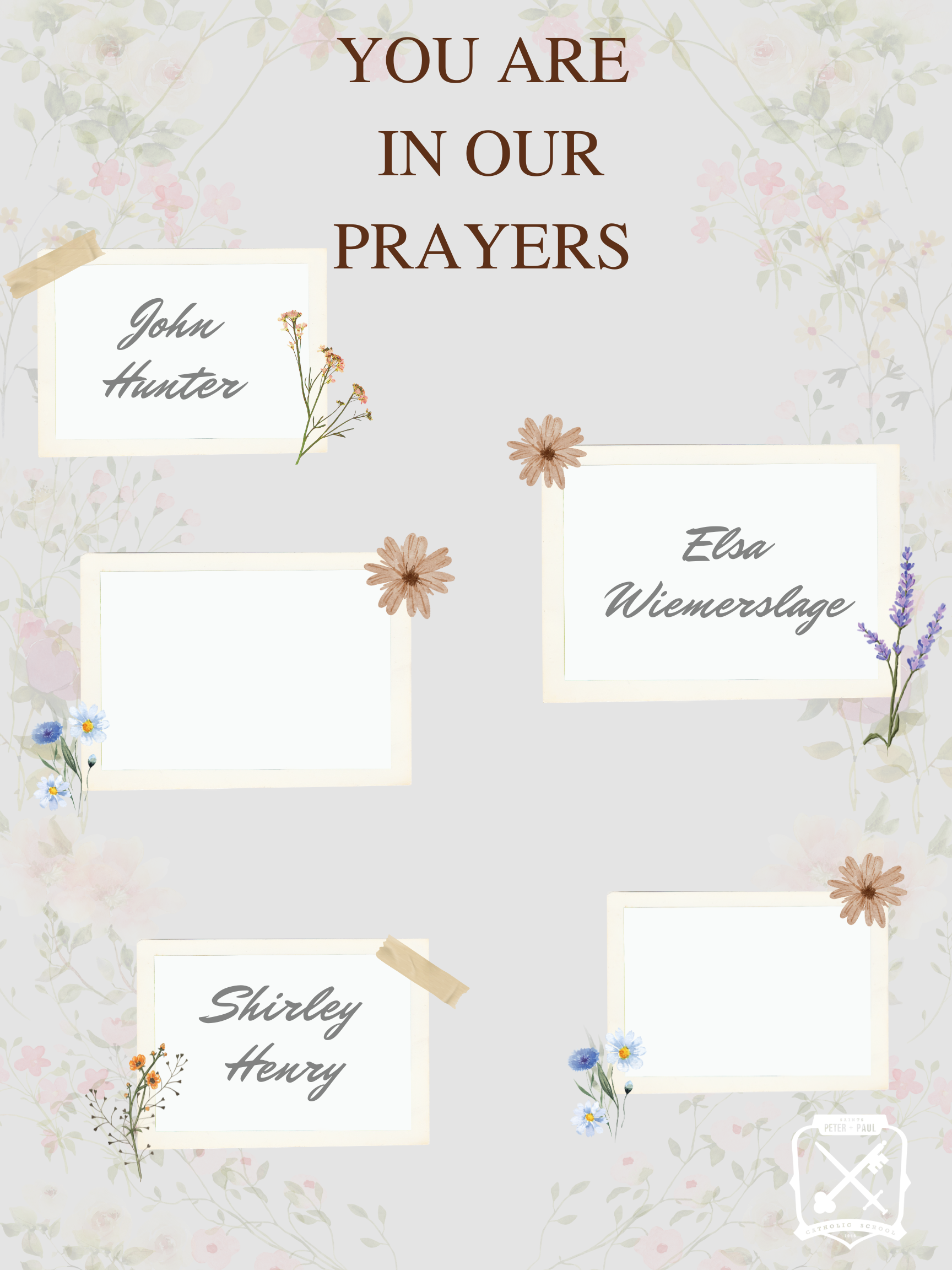 If you have anyone to add to our prayer list or a birth announcement please email Ms. Lynn at llutman@sppswaterloo.com